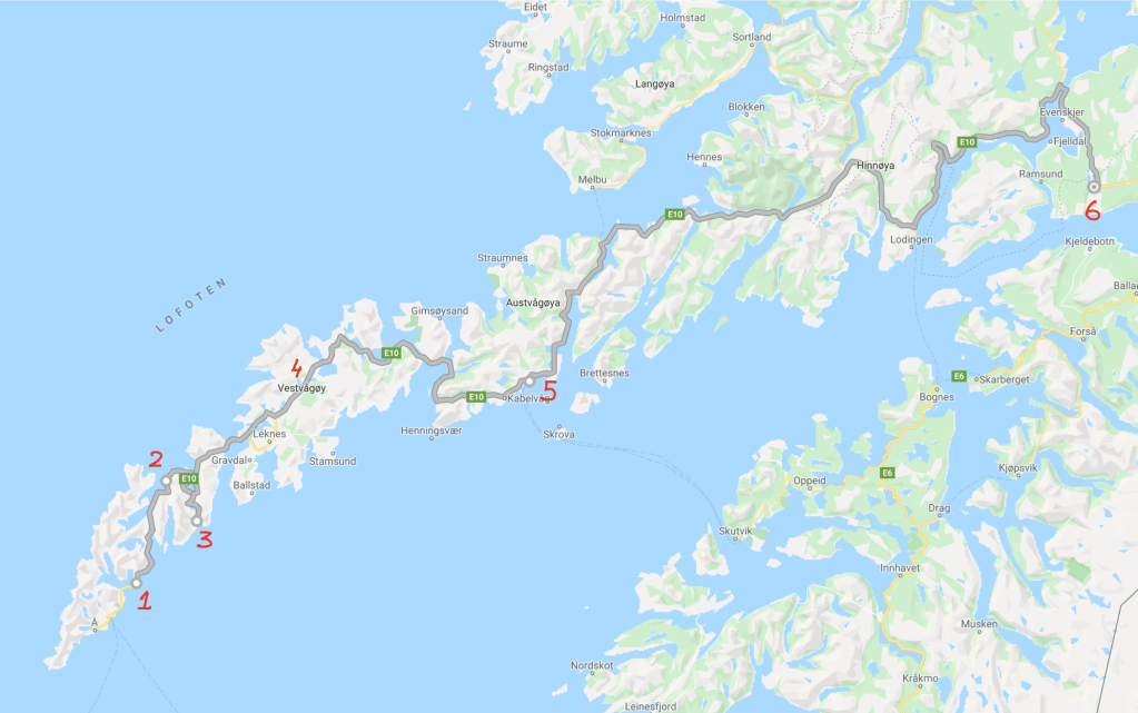 With lots of good memories and content, we checked-out from the Rorbu and started from the bright and sunny Hamnøy by 10.30 am. Our return flight from Evenes to Oslo was at 1930. Google maps predicted 5 hours for the drive. We still had couple of hours for some sight seeing on the drive back to the airport, we thought. When we reached our first stop, Ramberg beach [#2 in map], the weather changed suddenly and started raining. Without spending more time in Ramberg, we drove to the next destination Nusfjord [#3 in map].